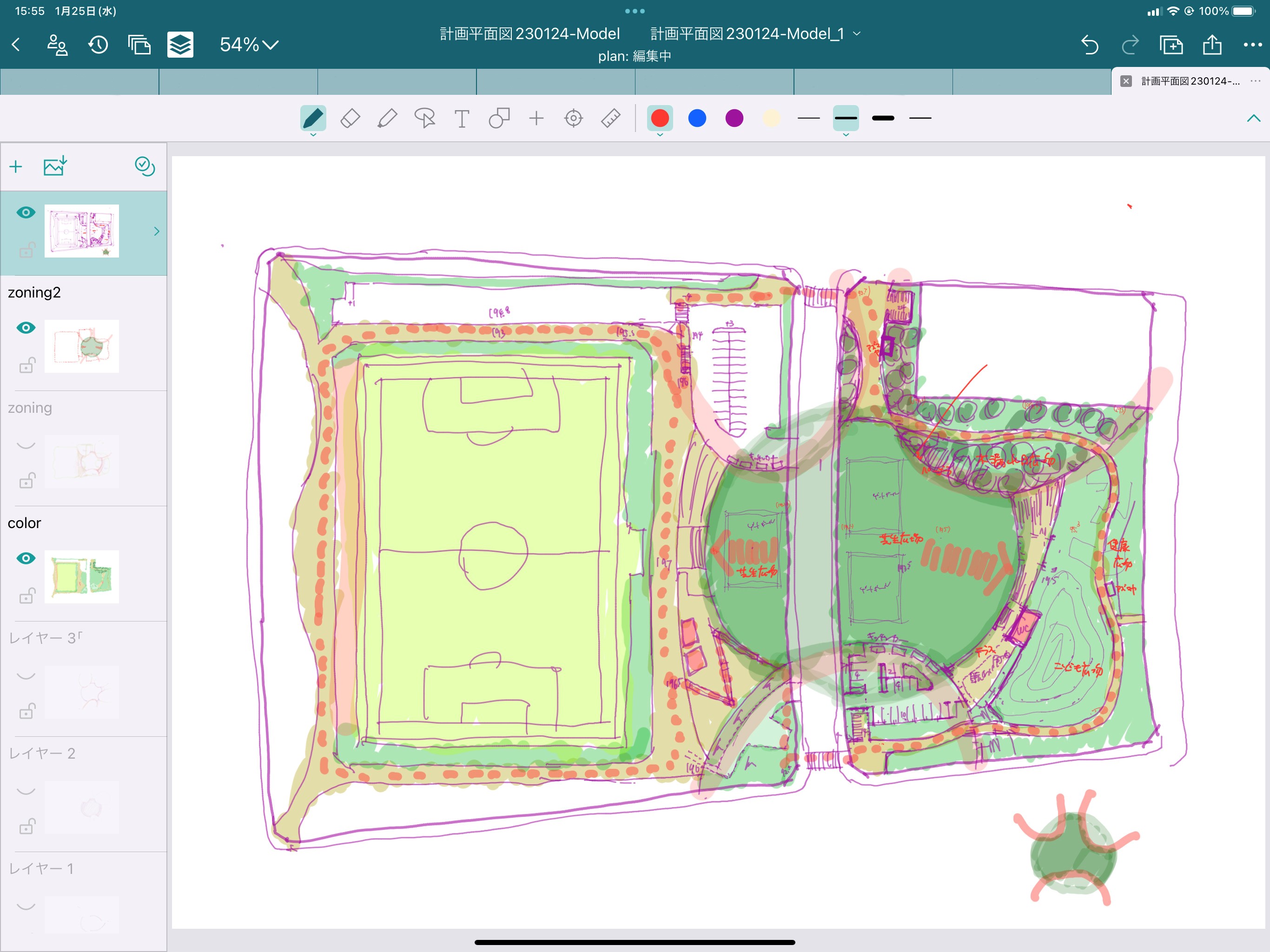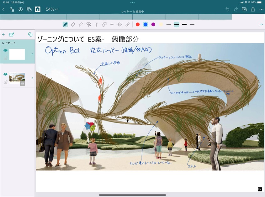 もうひとつ機能的に良い点はレイヤー機能です。レイヤーはCADでは一般的なのですが、レイヤーを重ねていってスタディをしていく際に、ひと昔前は手書きでトレーシングペーパーを重ねて上書きをしてブラッシュアップしていくという作業を、BuddyBoardで同じようにできるということが機能的な価値として非常に大きいです。建築設計は一発で決まるものじゃないので、こういうふうになるとどうなるだろうか、など試行錯誤しながら確認をしていき、やっぱりこれはないな、これでいこう、という作業をBuddyBoardだと容易くできるという点が大きなポイントですね。