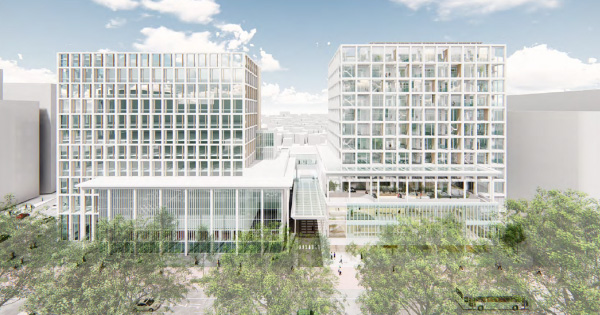 石川県金沢市に建設中の「Hirooka Terrace」(2025年7月竣工予定)は、当社の設計による「北國銀行本店ビル」(2014年竣工)に連結する「地域の架け橋となるオフィスビル」です。20,000㎡規模のオフィスビルでは全国初となる、Nearly ZEB(設計段階)を実現しました。周辺環境に対して閉鎖するのではなく、「点線のようにゆるやかに開かれたファサード」から、人びとのアクティビティが垣間見えるプロジェクトです。