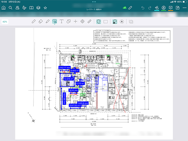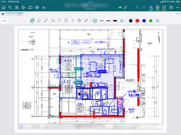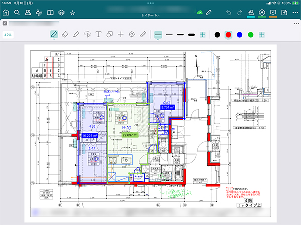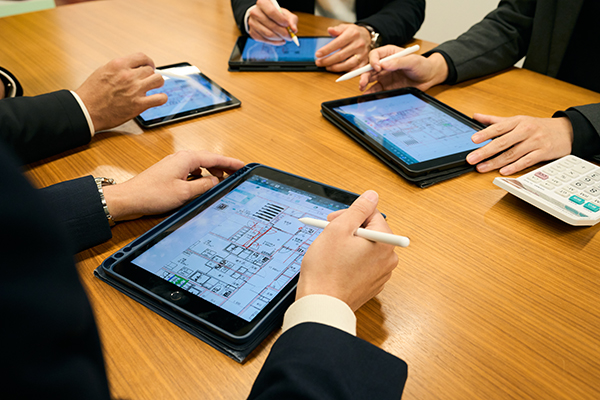 これまで設計に関する擦り合わせは紙やPDFで送られた図面をスクリーンショットし、画像編集アプリで書き込んで、それをまた送るというキャッチボールを繰り返していました。そのやりとりには相当な時間がかかっていました。しかし、2年ほど前にiPadを導入して、現在はBuddyBoardを活用することで、社外に出したい情報がまとめやすくなり、社内のキャッチボールが非常にスムーズになりました。奥富)