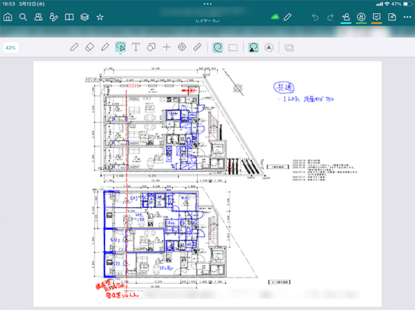 私が社内のDXを推進している時に、BuddyBoardを使用している隈研吾事務所の記事を見かけました。隈研吾さんとは宮の森というプロジェクトでご一緒していたので、「隈研吾さんの事務所がこういうのを使っているのだけど、どうだろう?」と社内に提案してみました。ちょうど私自身がiPadで図面に手書きを始めた頃だったので、導入すれば時間も効率も良くなるのではないかと考えたためです。隈研吾事務所の事例を見ると、そのレベルの高さに驚かされます。BuddyBoardを使ってゼロから絵を描いていて、本当にすごいと思いました。私たちの用途は設計事務所とは異なり、検品のような役割を担っていますが、隈研吾事務所はBuddyBoardを使ってゼロから提案資料を作成しています。設計事務所はさらに業務効率化を図っているようで、BuddyBoardには私たちが使っている以外にも、もっと多くの使い方があるのではないかと感じています。石川)