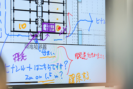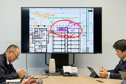 辻村:弊社の場合は設計グループ内で毎週検討会をやっています。検討会の1週間前に物件の図面をBuddyBoardへアップロードしておいて、それを各自が検討会の前までに図面に確認事項等を書き込みし、その書き込んだ内容を検討会当日にみんなで確認し合っていくという形で使っています。検討会前の図面確認時には、同時書き込み機能が便利ですね。被りがなく、書き込みのロックとかしなくてもいいので、非常に効率的です。検討会時には確認時にポインター機能を活用しています。
