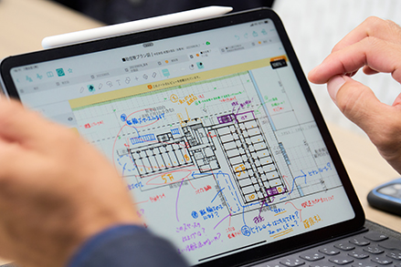 大谷:最近はお客様との打ち合わせに行くときにも結構使っています。ペーパーレスも進んでいるので、打ち合わせ用の図面データを事前にBuddyBoardへ取り込んでおき現場で書き込んで確認をしています。確認作業が終わった後はPDFに書き出して、そのデータを保存したり、そのままお客様へ送るといった使い方をしています。建築現場で外観を変える検討をした時、手書きで窓の追加や色の変更など書き込んだりもしています。