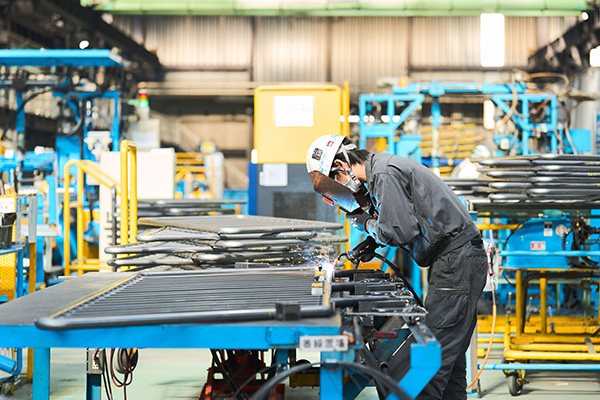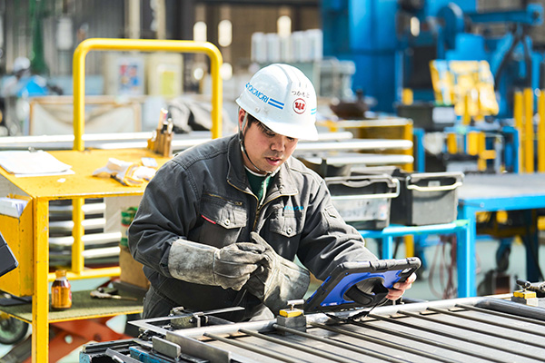 横森製作所は階段の設計・製作・施工の会社です。日本全国に事業を展開しており、8支店と9工場が、北は北海道から南は九州まであります。私の勤務する児玉工場は関東圏内の工場の一つです。工場によって生産する階段の種類や物は異なり、児玉工場は主に東日本の物件の屋外階段の製作から搬入を行っています。児玉工場には30人の社員が所属しており、生産管理課、厚板課、加工組立課の3つの課に分かれています。さらに加工組立課では階段グループ、鉄骨グループ、手すりグループの3つに分かれており、塚本や私は手すりグループの一員として手すりの生産を行っています。手すりは製造ラインにて生産されるのですが、案件ごとに手すりの形状が異なるため、生産する際には工作図と呼ばれる図面を見ながら業務を進めます。そして工作図には、その案件の生産状況や、生産にあたる際の留意点など、様々な情報が手書きで記録されます。その記録は自分のためでもあり、関係者のためでもあります。