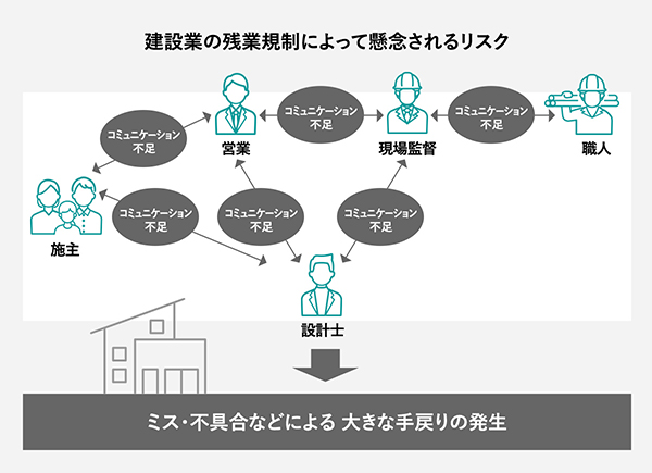 残業規制への対応では、そのボリュームの大きさから削減対象となりやすいのが、施主様と設計士との打ち合わせや現場監督の巡回など、「コミュニケーションに関わる時間」なのではないでしょうか?