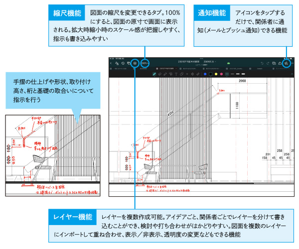 直進階段の立面図について、手摺のディテールや取り付け高さ、桁の納まりについて修正を指示している様子。「修正後に、右上の通知機能をタップすれば、メンバーに情報を共有できる、というのはとても便利だと感じました。ただし、通知をOFFにする機能があれば、通知を受け取る側に対してストレスを与えることがなくなるので、より理想的だと思います」(秋山氏)