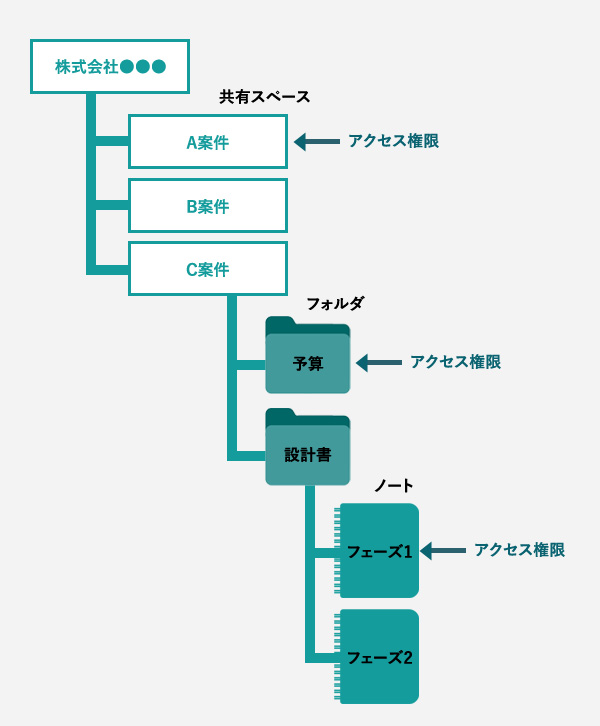このような構造のため、BuddyBoardは共有スペース/フォルダ/ノートのそれぞれに対し、ユーザーごとあるいはユーザーグループごとのアクセス権限を付与することが可能です。