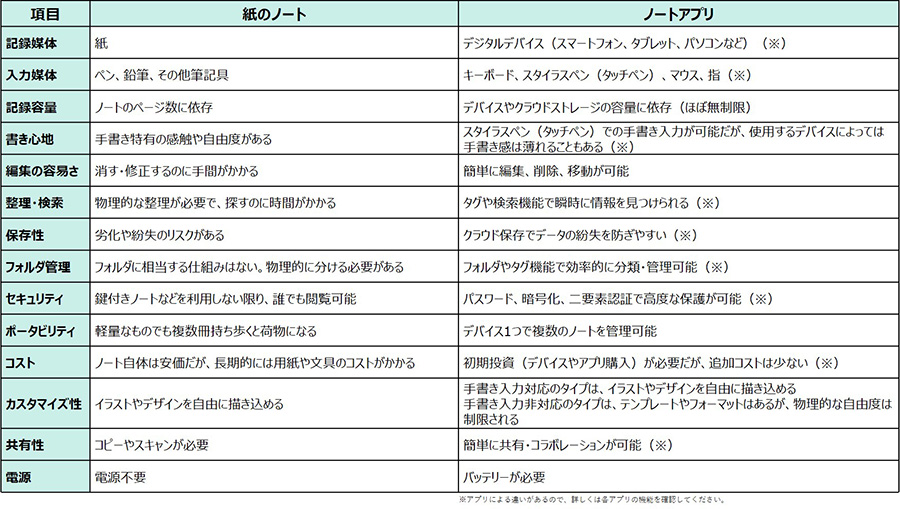 以上、10の視点から、ノートアプリの種類と法人利用ならではのチェックポイントを解説しました。利用者がどのような使い方をしたいかをイメージした上で、必要な機能を網羅するノートアプリを選択しましょう。特に業務効率化が導入の大きな目的の場合、「共有型(クラウド型)」「マルチデバイス対応」「手書き対応」の3つの機能はぜひ押さえておきたいところです。
